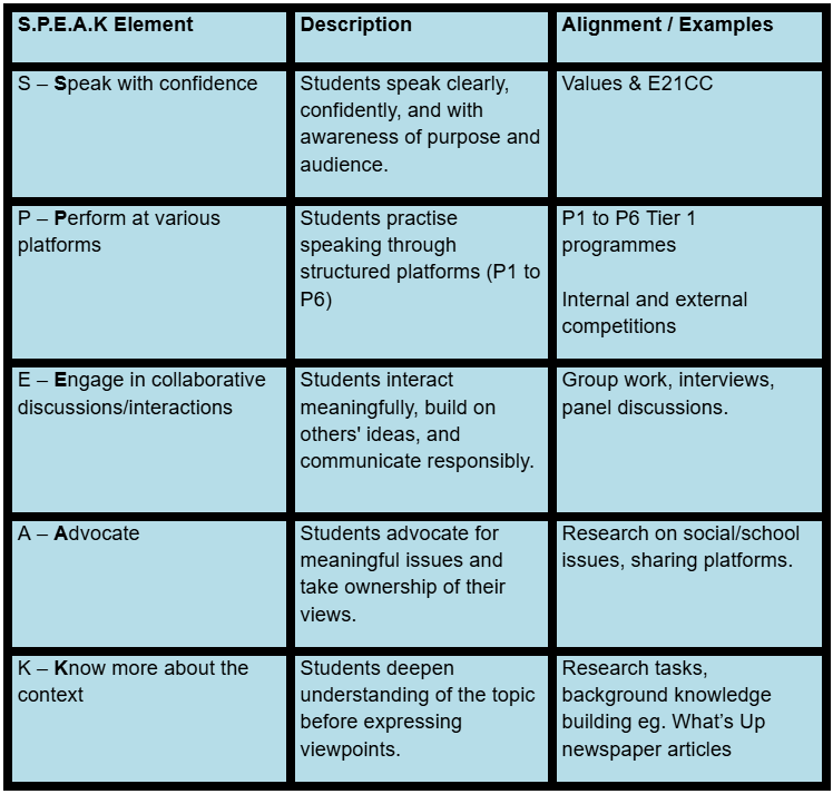 At Seng Kang Primary School, our Applied Learning Programme (ALP) is designed to develop students as confident and competent communicators in internationally acceptable English. Through a structured and progressive approach to oracy, students are provided with authentic platforms to express ideas, engage audiences and communicate with purpose.