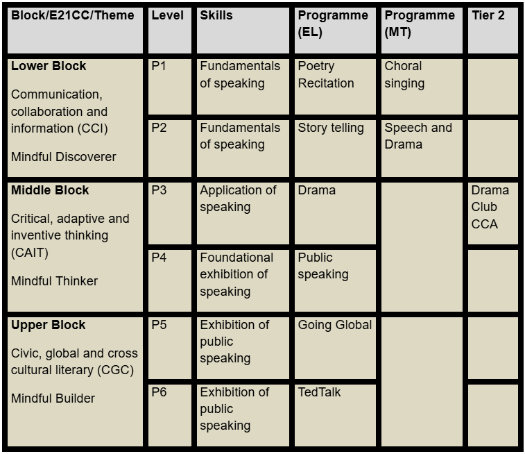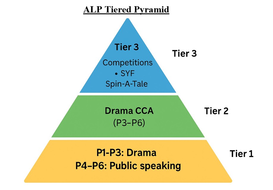 At Tier 1, all students are provided with foundational learning experiences through the curriculum. Students in Primary 1 to 3 engage in Drama, where they build confidence in expression, voice and movement. In Primary 4 to 6, the focus shifts to Public Speaking, where students learn to organise their ideas, present with clarity and engage an audience.